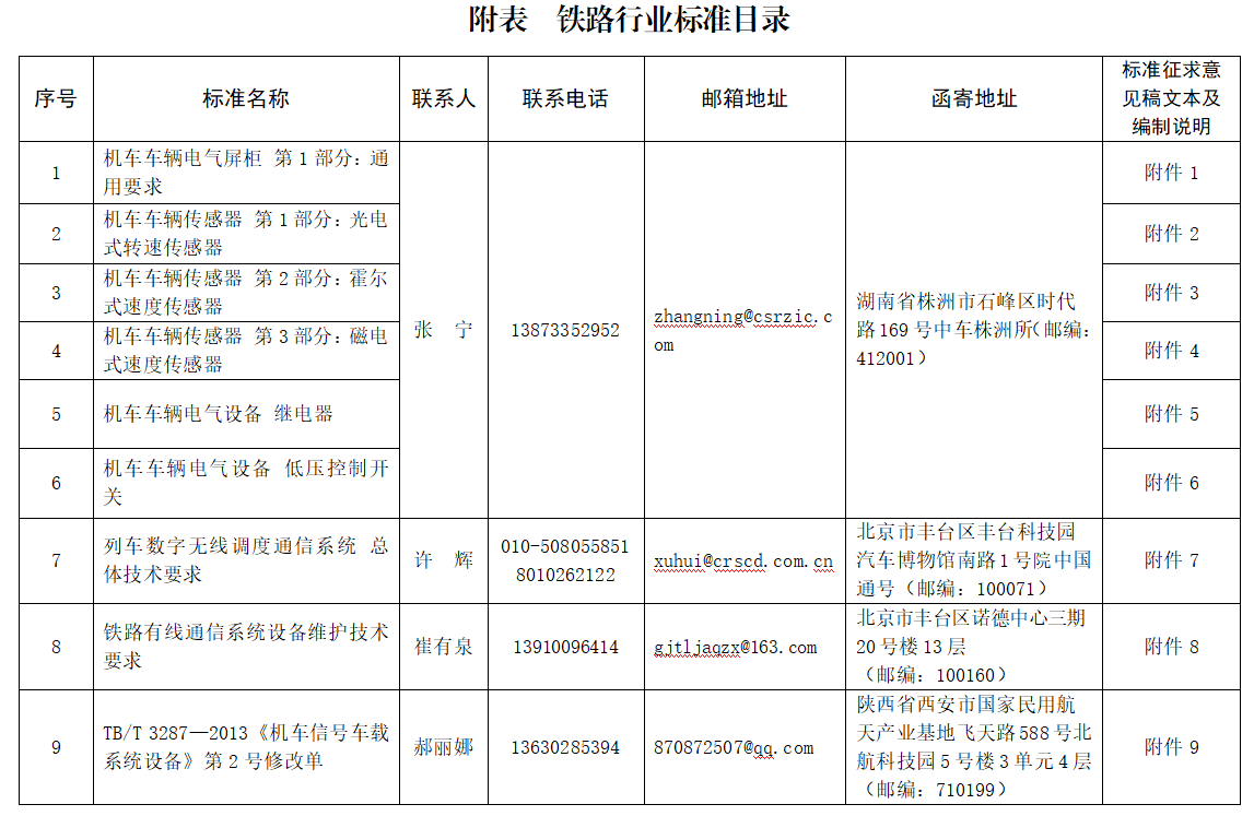 根據鐵路行業技術標準管理辦法的相關要求,現就《機車車輛電氣屏柜 第1部分:通用要求》(征求意見稿)等9項鐵路行業標準和標準修改單公開征集意見(見附表和附件1—9)。請于2026年1月3日前將《鐵路行業標準征求意見表》(見附件7)通過電子郵件或信函方式實名提出反饋意見,逾期視為無意見。
