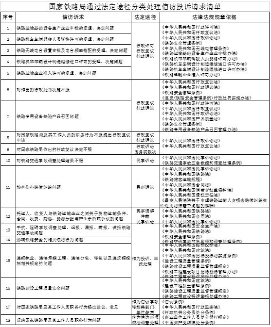國家鐵路局通過法定途徑分類處理信訪投訴請求清單