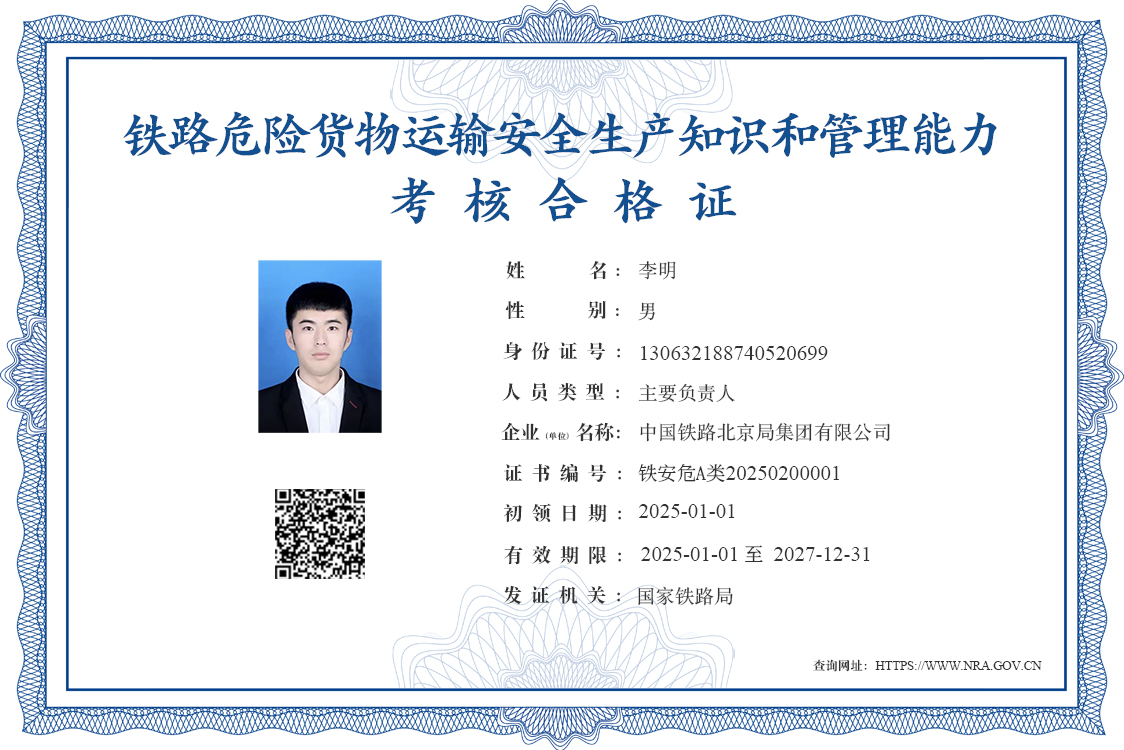 圖2.鐵路危險貨物運輸安全生產知識和管理能力考核合格證式樣