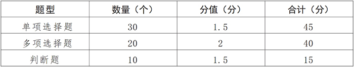 1.試題類型包括:單項選擇題、多項選擇題、判斷題,全部為客觀題。多項選擇題中,全部選對得2分;少選,所選的每個選項得0.5分,多選、錯選不得分。題型數量及分值見下表。