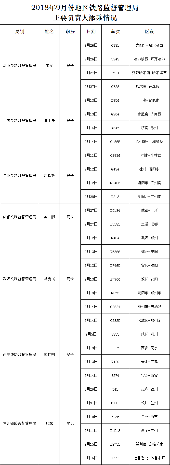 2018年9月份地區鐵路監督管理局主要負責人添乘情況