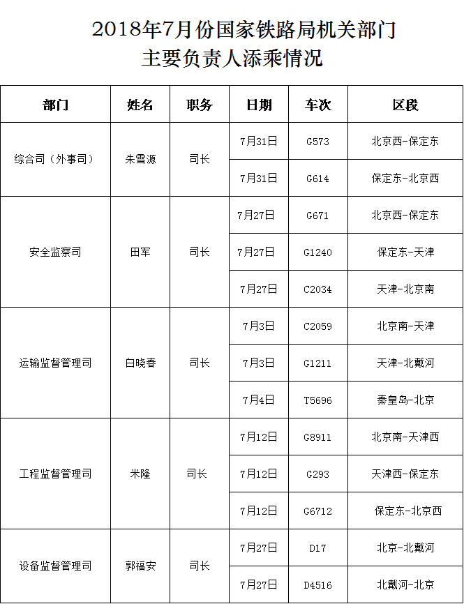 2018年7月份國家鐵路局機(jī)關(guān)部門主要負(fù)責(zé)人添乘情況