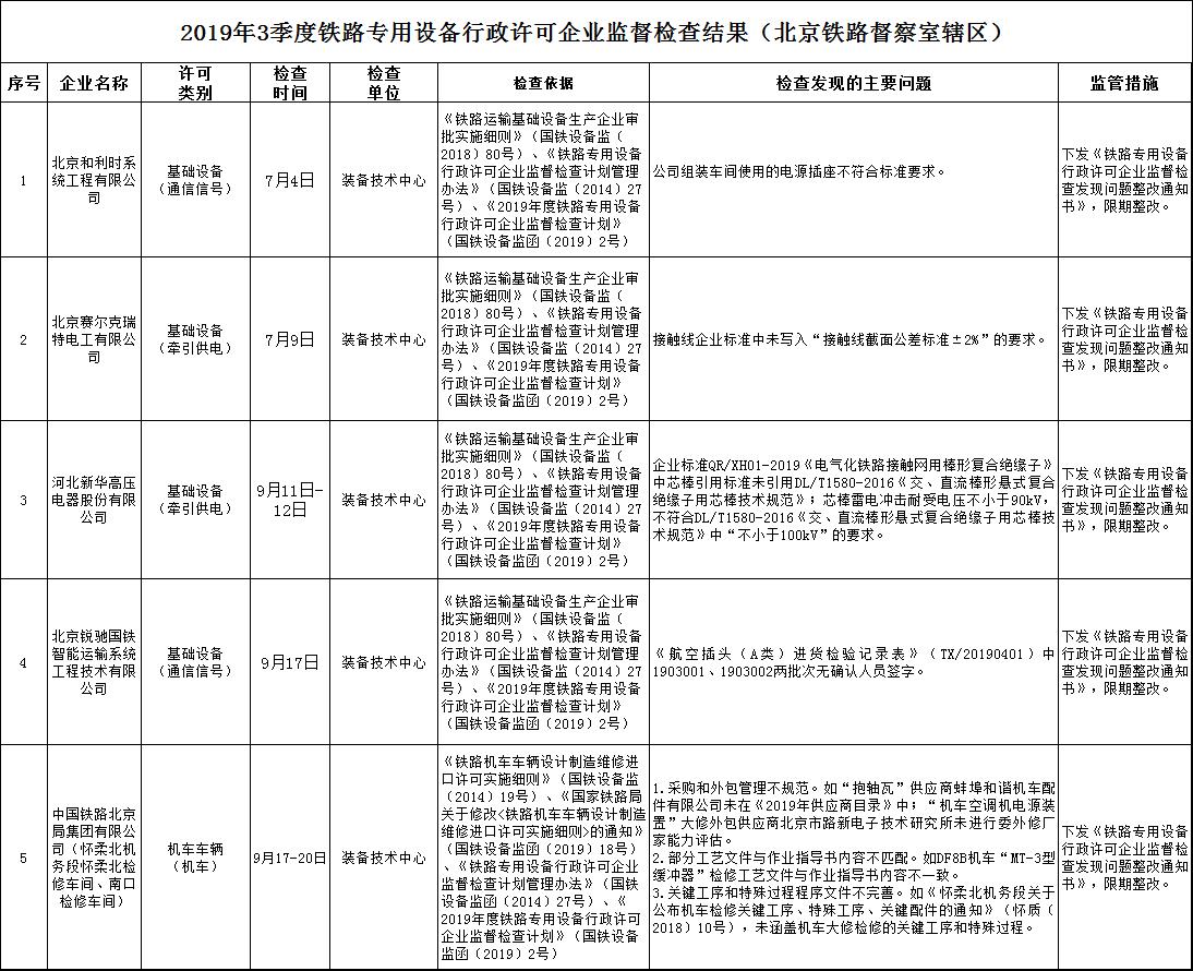 各地區(qū)鐵路監(jiān)督管理局認(rèn)真按照《國(guó)家鐵路局關(guān)于印發(fā)<2019年度鐵路專用設(shè)備行政許可企業(yè)監(jiān)督檢查計(jì)劃>的通知》(國(guó)鐵設(shè)備監(jiān)函〔2019〕2號(hào))要求,對(duì)轄區(qū)內(nèi)搖號(hào)隨機(jī)確定的鐵路專用設(shè)備行政許可受檢企業(yè)按程序、標(biāo)準(zhǔn)開展監(jiān)督檢查,共檢查企業(yè)10家,發(fā)現(xiàn)問題79項(xiàng),下發(fā)《鐵路專用設(shè)備行政許可企業(yè)監(jiān)督檢查發(fā)現(xiàn)問題整改通知書》10份。按企業(yè)生產(chǎn)類別分,鐵路機(jī)車車輛生產(chǎn)企業(yè)6家、鐵路運(yùn)輸基礎(chǔ)設(shè)備生產(chǎn)企業(yè)4家;按企業(yè)監(jiān)管轄區(qū)分,沈陽鐵路監(jiān)督管理局轄區(qū)2家、上海鐵路監(jiān)督管理局轄區(qū)3家、廣州鐵路監(jiān)督管理局轄區(qū)1家、成都鐵路監(jiān)督管理局轄區(qū)1家、西安鐵路監(jiān)督管理局轄區(qū)3家。設(shè)備監(jiān)督管理司組織裝備技術(shù)中心對(duì)北京鐵路督察室轄區(qū)內(nèi)5家鐵路專用設(shè)備行政許可受檢企業(yè)(鐵路機(jī)車車輛生產(chǎn)企業(yè)1家、鐵路運(yùn)輸基礎(chǔ)設(shè)備生產(chǎn)企業(yè)4家)開展監(jiān)督檢查,共發(fā)現(xiàn)問題15項(xiàng),下發(fā)《鐵路專用設(shè)備行政許可企業(yè)監(jiān)督檢查發(fā)現(xiàn)問題整改通知書》5份,監(jiān)督檢查情況詳見附表。