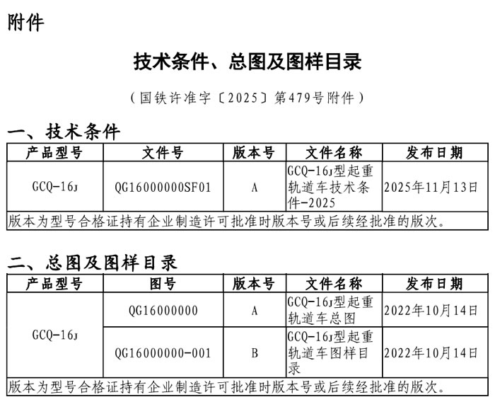 1.準予你單位GCQ-16J型鐵路基礎設施檢修裝備制造許可,并向你單位頒發制造許可證(含附表),證書編號:TXZZ0501-00483,有效期至2030年11月9日;
