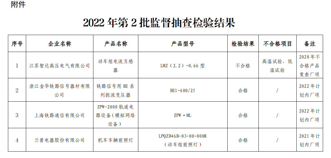 根據(jù)《鐵路專用產(chǎn)品質(zhì)量監(jiān)督抽查管理辦法》(國鐵設(shè)備監(jiān)規(guī)〔2020〕63號),現(xiàn)將2022年第2批鐵路專用產(chǎn)品質(zhì)量監(jiān)督抽查情況通報如下: