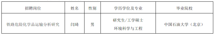 根據(jù)事業(yè)單位公開招聘工作有關(guān)規(guī)定,按照《國家鐵路局市場監(jiān)測評價中心2023年度公開招聘應屆畢業(yè)生公告》要求,現(xiàn)將我單位2023年度公開招聘應屆畢業(yè)生“鐵路危險化學品運輸分析研究”崗位擬聘用事業(yè)單位工作人員予以公示,“鐵路運輸市場分析研究”崗位因無人滿足進入體檢考察環(huán)節(jié)要求,取消該崗位招聘計劃。公示期間,如有問題,請向我單位反映,或直接通過中央和國家機關(guān)所屬事業(yè)單位公開招聘服務平臺反映。